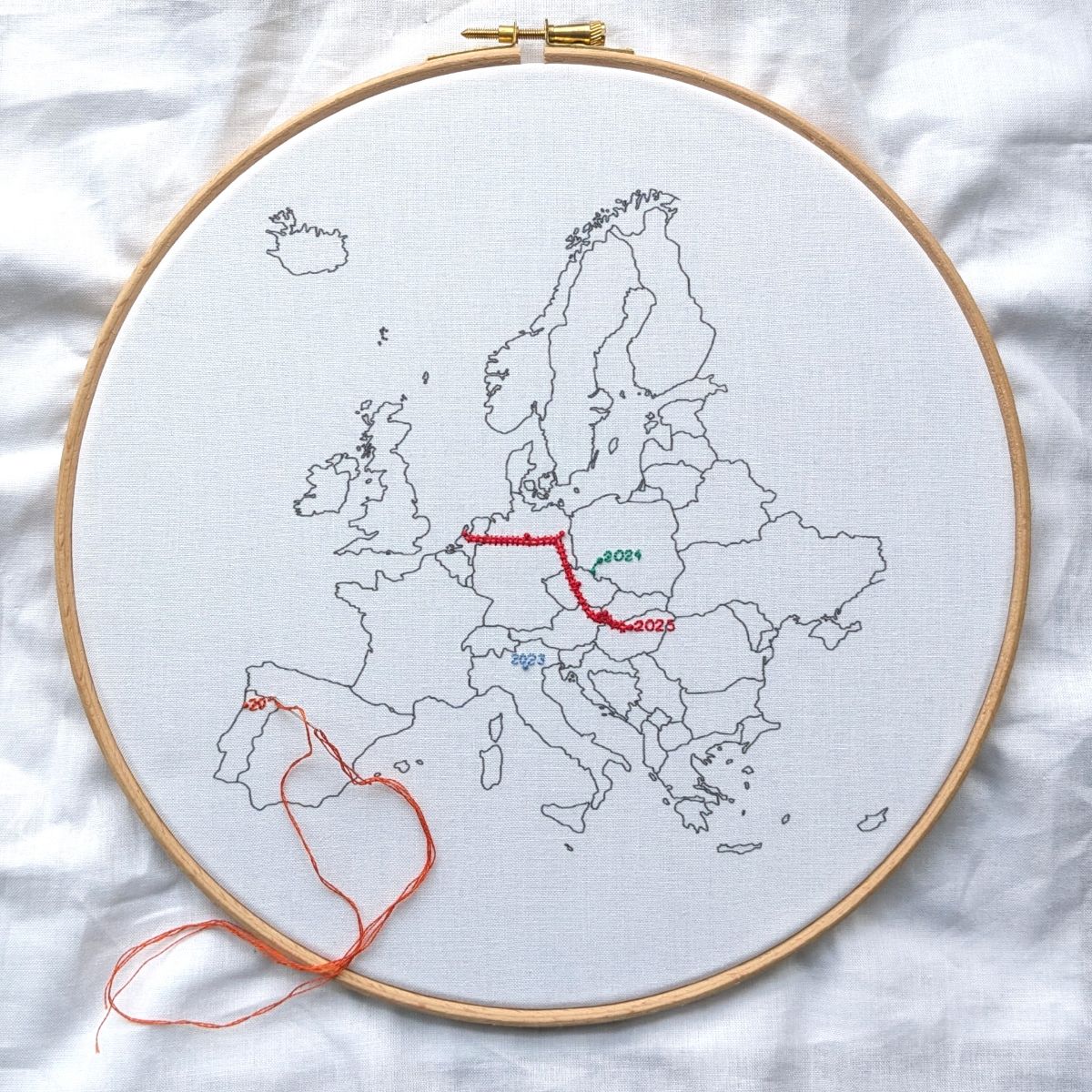 A detailed outline of Europe, suitable for a 10″ embroidery hoop. Use this to mark your home town or country, places you’ve been on holiday, countries that you’ve visited… Fill in countries, add dates, travel routes…. So many uses! I am stitching the places that we have been on holiday!
