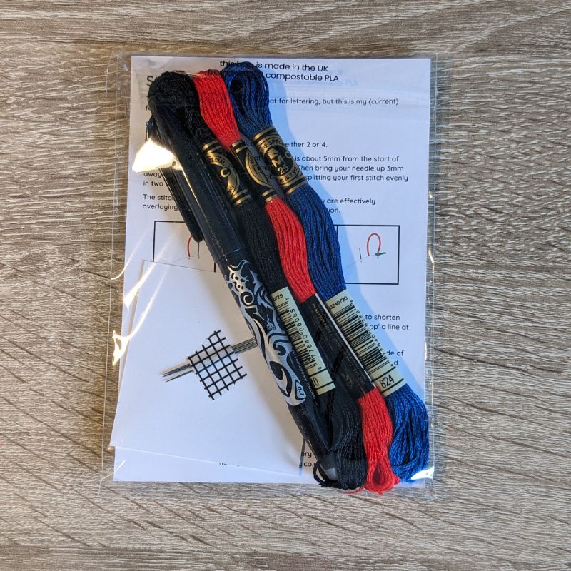 • 3 skeins of DMC embroidery thread in ‘biro’ colours of black, blue and red